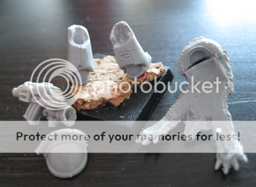 the torso is an upside down plastic space marine torso, but will add some greenstuf detailing to hide the fact. might still add another ring of plasticard to extend the waist down, or maybe try to give him some sort of codpiece or loincloth, although once I add the bolter the gaping hole will be covered a bit more so maybe that won't be necessary. The bolter will be pinned in place across his chest, and a pair of shoulderpads will be added.