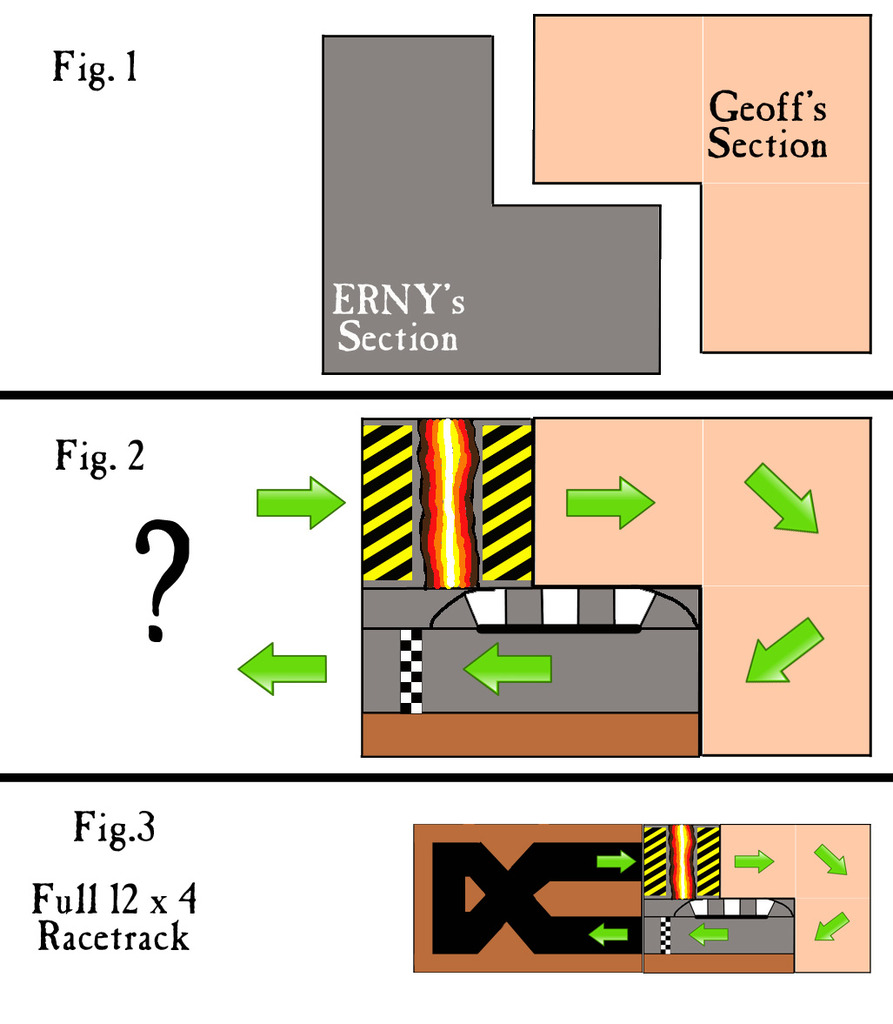 There is one more thing - I'd really really appreciate it if someone could help us out with the last piece of the track puzzle - Fimm and Erny are working on half the track but we'd ideally like to extend it to 12 x 4. To do so will likely require a 6 x 4 mat or heavy cloth with the rest of the circuit painted on - a nice big figure 8 for maximum carnage as detailed in my very concise MS paint diagram: