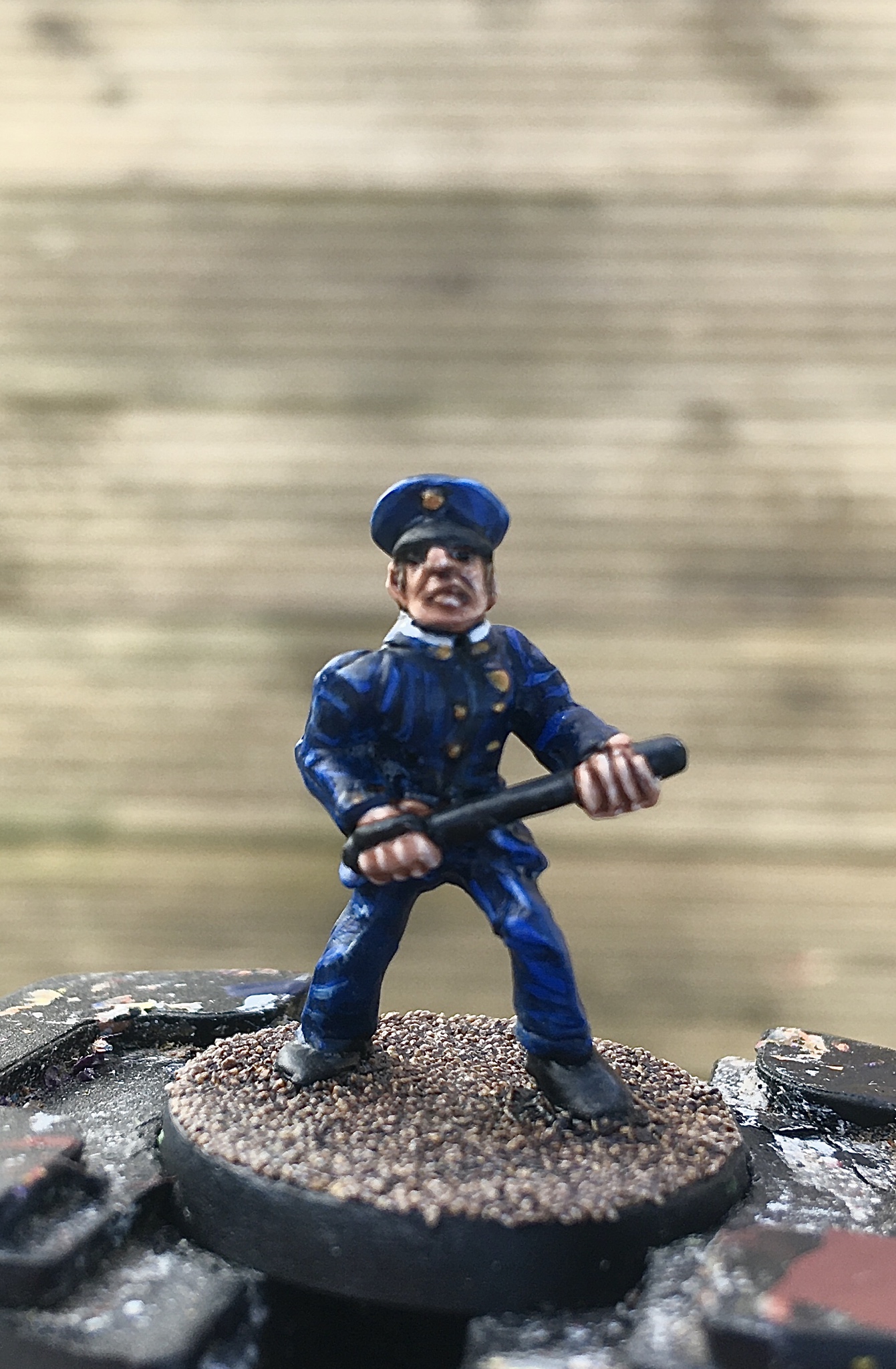 He's tiny - a Wee Jimmy Krankie of a Cop - which is one of my excuses for the paint job. That and bad light, and paint drying too quickly...- he's passable, but not a favourite paint job or miniature by a long shot. He's not the worst miniature in the range but he's definitely not the best either.