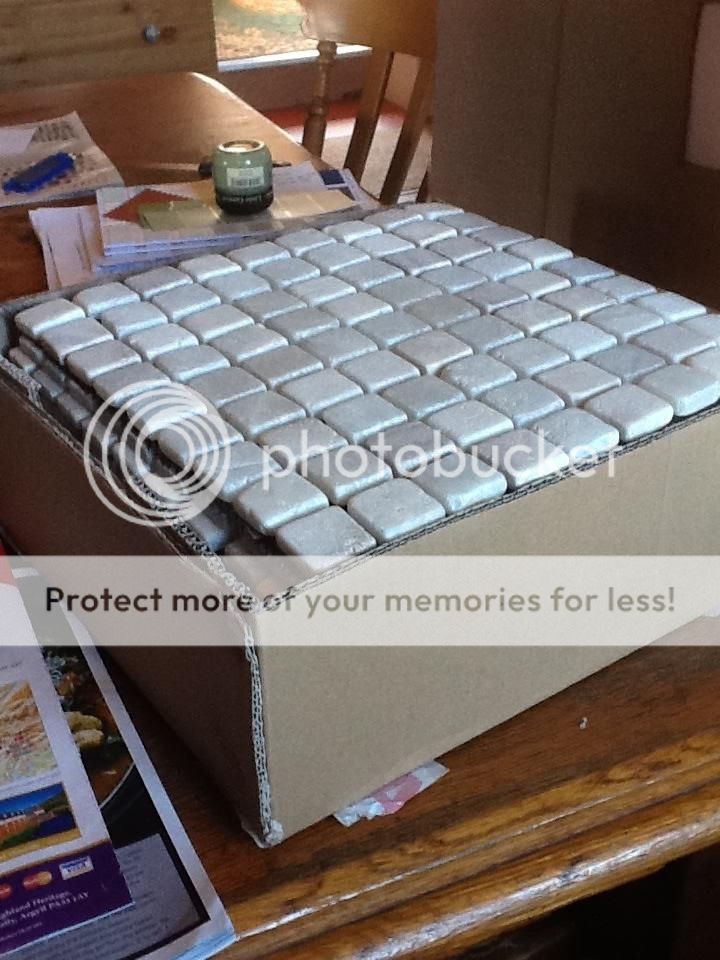My wife has recently taken up mosaicing and when she was ordering some tiles the other day I saw some marble ones that were *perfect* for making some dungeon tiles. Or almost perfect. They were only 20mm square, and as our group only plays Warhammer Quest (in terms of dungeon crawling) too small. However I had a look on some other website and found some 30mm square onyx tiles, with delivery only £35 for a square metre. More than enough for a whole dungeon.
