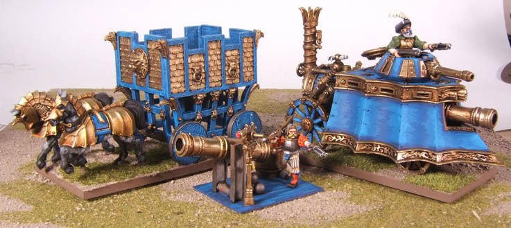 Found some old photos. The initial war wagon has been done for a while, so I hadn't posted close up pics here. In WFB terms, in the past few editions, I used it as an unSteam Tank. The cannon & crew are removable so I can put other armaments/crew in it as well -- such as the last pic with a warrior priest and enormous statue of the god Manann.