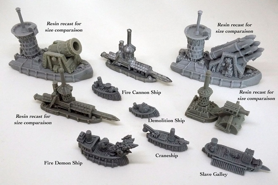 A group of amateur sculptors and enthusiasts are currently busy at a cooperative, fantasy evil dwarf smallscale ship project over on Chaos Dwarfs Online (Warseer link). The models will be roughly compatible with Man o' War, Dreadfleet and Uncharted Seas, given how relative the scale of fantasy vessels are. The aim is to cast and sell the ships, though they'll be restricted to 3-4 moulds. Given the limited market and a need for the moulds to repay themselves, all escorts will go in one mould, forming one bundle kit so collectors will have to get several escort bundles to make squadrons of any single ship type, and the same will be true for the cruisers, submersibles and capital ships.