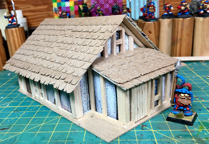 While I continue to chip away at my Terrain board project I have also started the process of learning how to make buildings for my fantasy games. Having very fond memories of the old Warhammer Townscape Card buildings I decided to use that selection of buildings as templates for 3d versions. To that end I printed out a scan of one of the buildings (a basic timbered house) and mounted it to 1/4in foamboard with spray adhesive and cut out the panels. These were glued together with PVA, mounted on some thick card for a base...and I started adding the details.